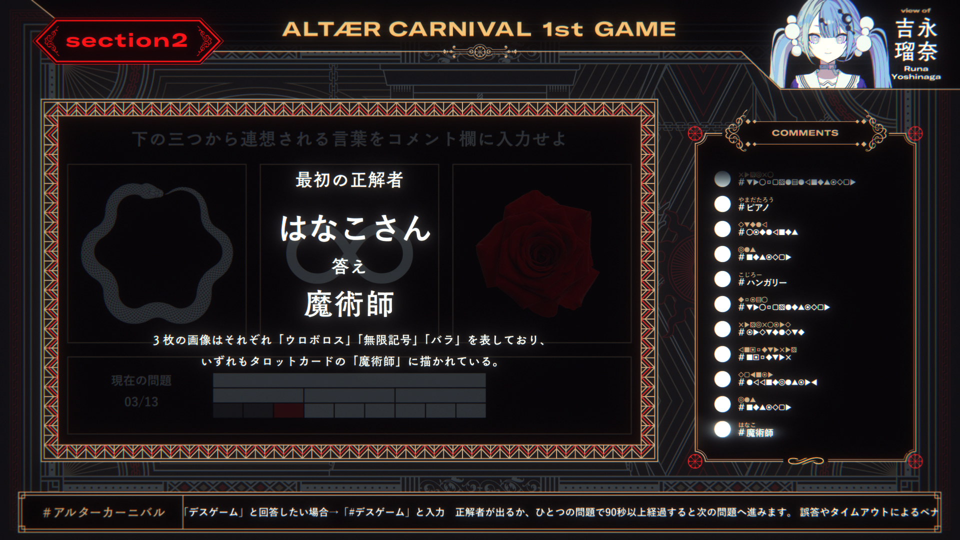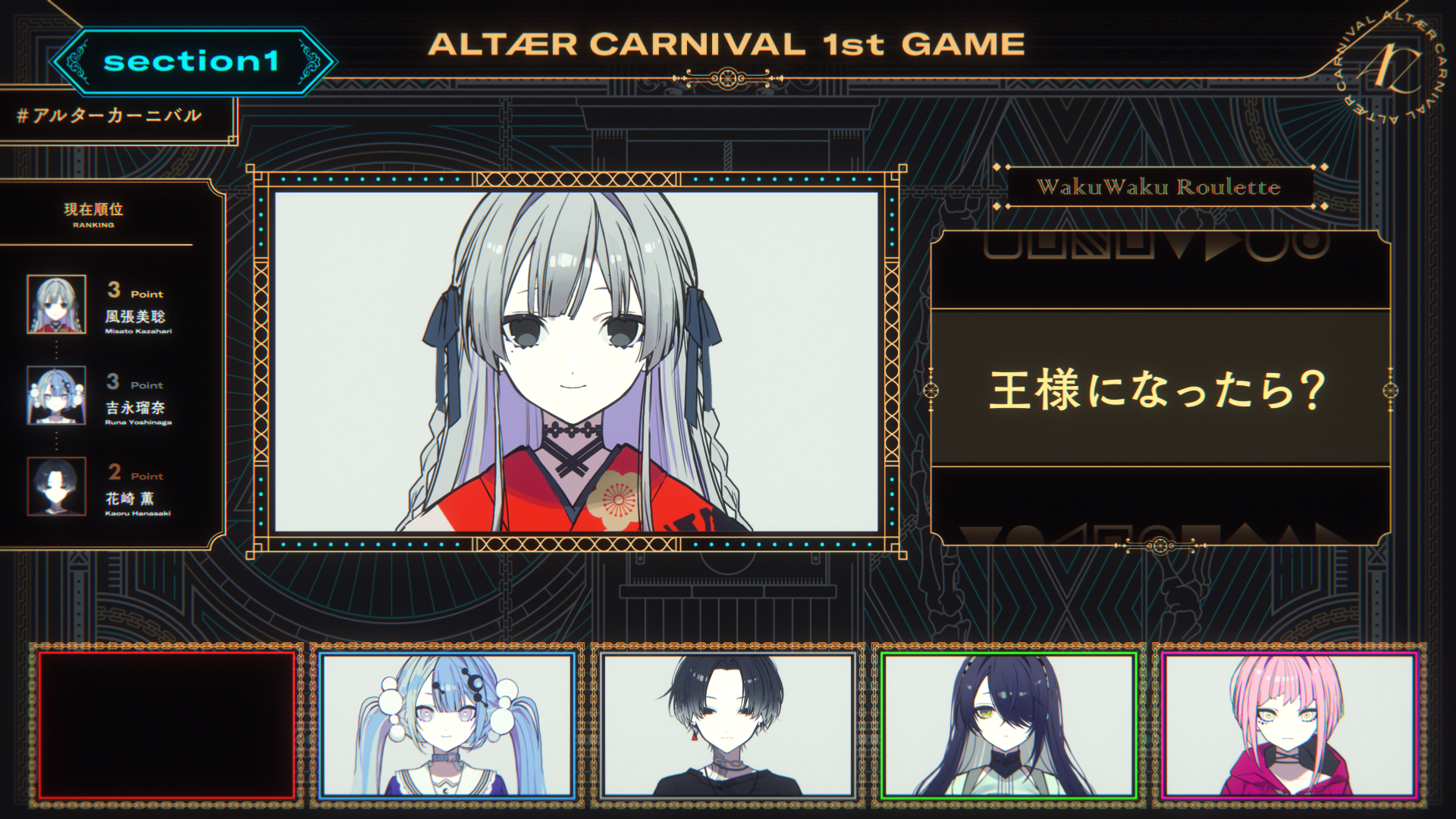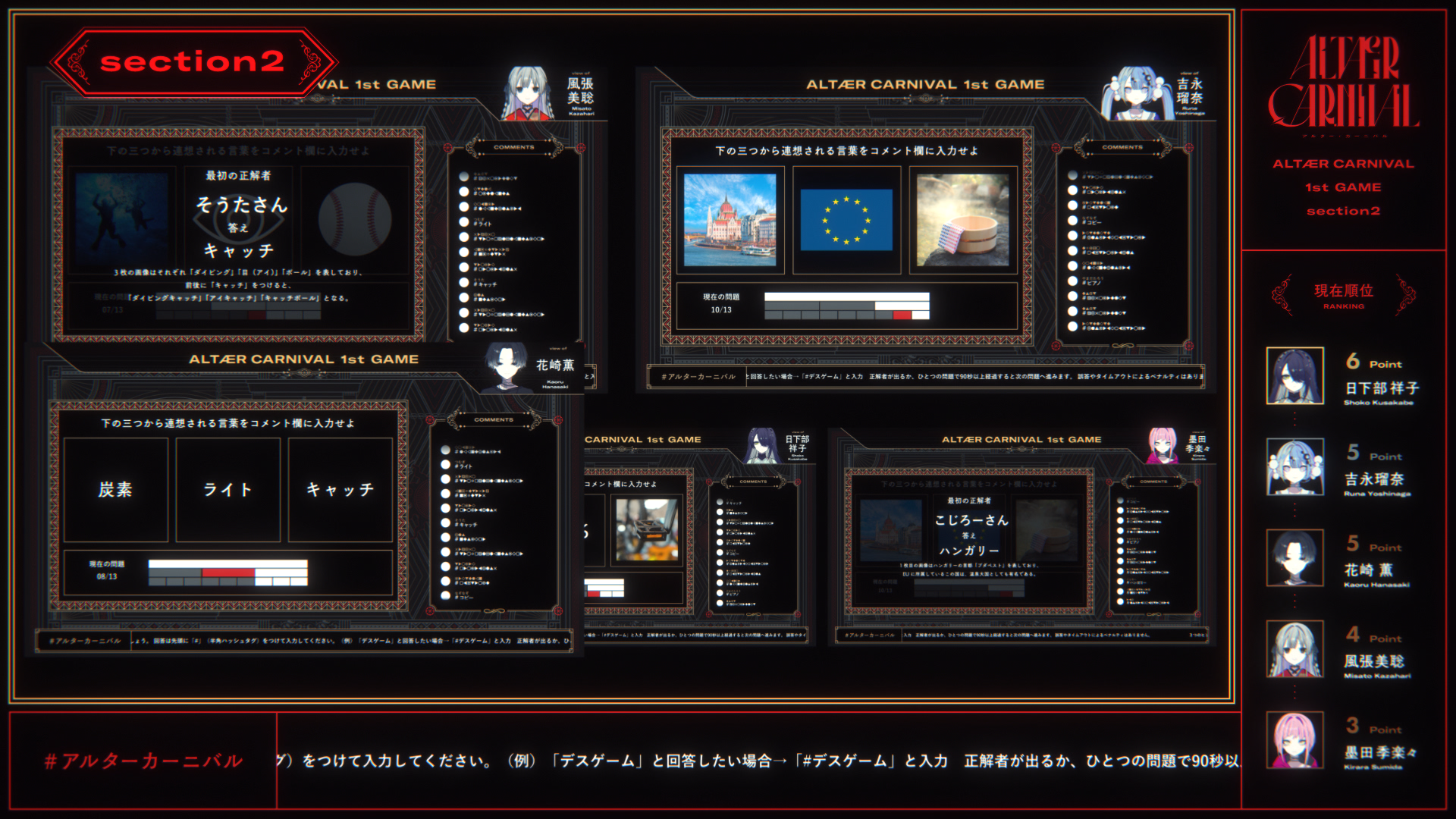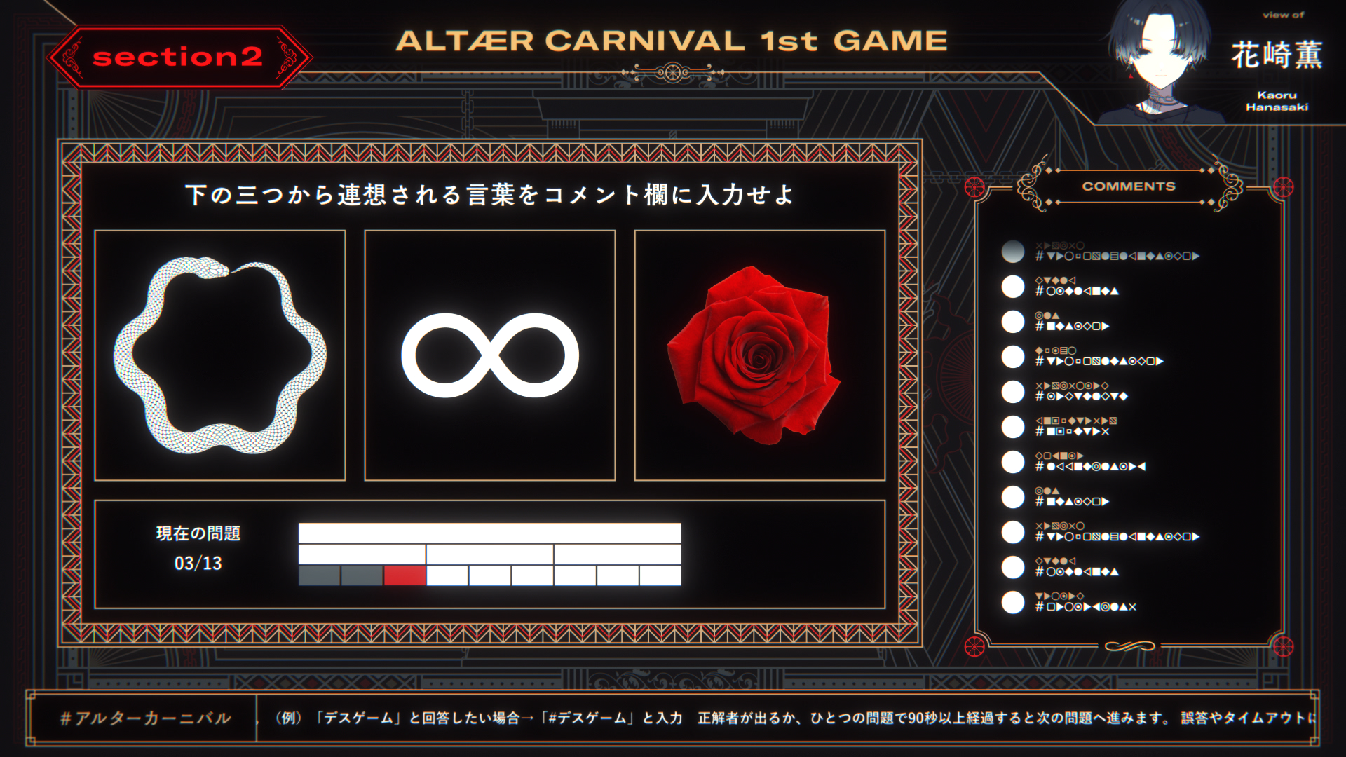 「セクション2」では、キャラクターごとに配信枠が立ち上がりますので、協力したいキャラクターの配信に移動することで、キャラクター・他の視聴者と共に、謎解きに挑戦して頂けます。また、謎解きが始まる前や解き終わった後などに、キャラクターとコミュニケーションが取れる時間もご用意しております。『ALTÆR CARNIVAL』は推しの命をかけたゲームです。ぜひ悔いのないように。