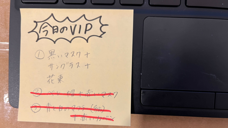 そして15:00の回では、その付箋に何が書かれているのかの特定が進められていきました。その中で、【付箋には「今日のVIP」「黒のマスク」…と書かれている】といったことが判明していきます。しかし付箋の文字は薄く、またサイズも小さいため、その内容を読み解くのは困難でした。そして、正確な内容が分からぬまま、15:00の回は終了してしまいます。